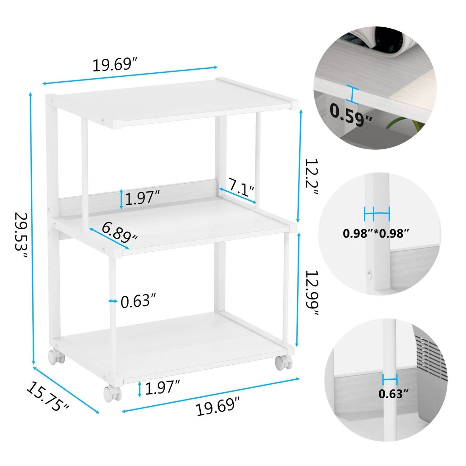 Save valuable space and gain mobility for your printer, scanner, fax machine, or any other office machines and materials with this Modern White Metal 3-Shelf Printer Stand Mobile Desk Organizer Cart on Wheels. With a design that’s both stylish and piratical, this printer table offers a versatile storage solution and a modern rustic aesthetic for your home office. Quality construction and durable steel frame ensures the long-lasting appeal of this small storage stand with shelves.