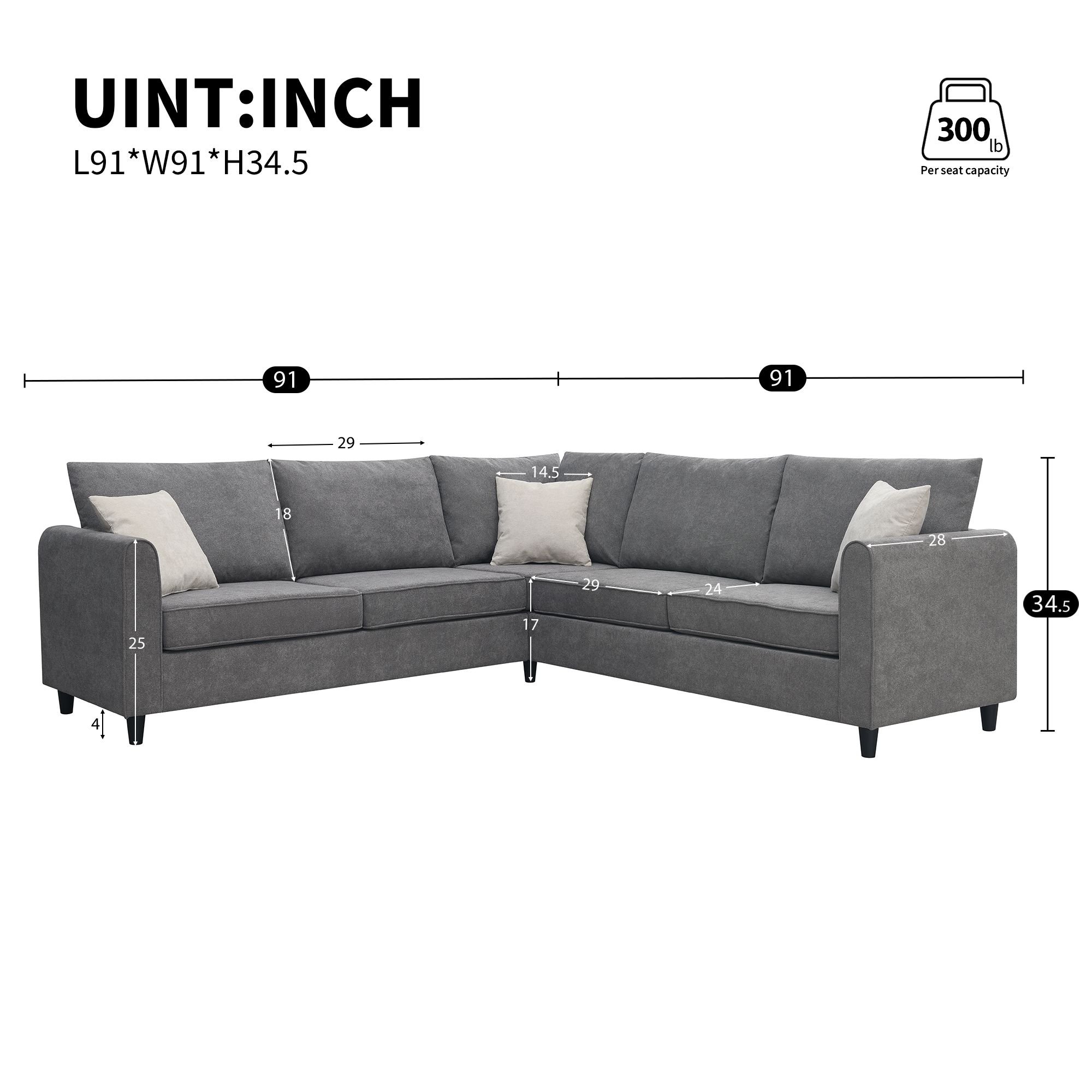 Easy to Assemble: This L-shape sofa needs to be assembled, instructions manual and tool included, Overall size: 91"(L)* 91"(W)"* 33.5"(H).In order to facilitate the assemble, we use the plastic legs and strong semi-attached cushions to avoid too many accessories to install.