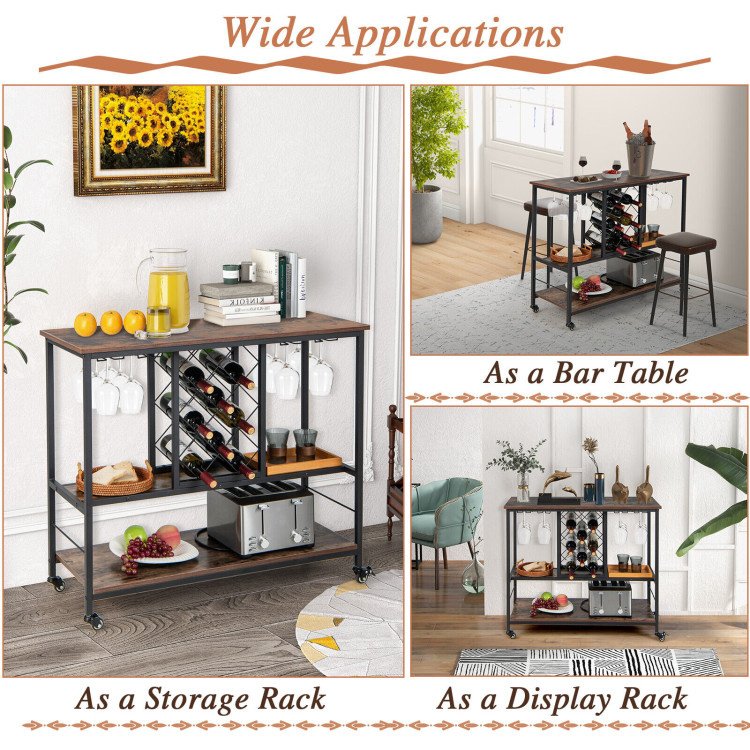 3.Sturdy Construction: This mobile wine rack table is constructed from a heavy-duty metal frame. With boards of good quality, this rolling wine cabinet provides strong support and is not easy to bend or break, which can serve you for a long time. Besides, the side bars prevent items from dropping.