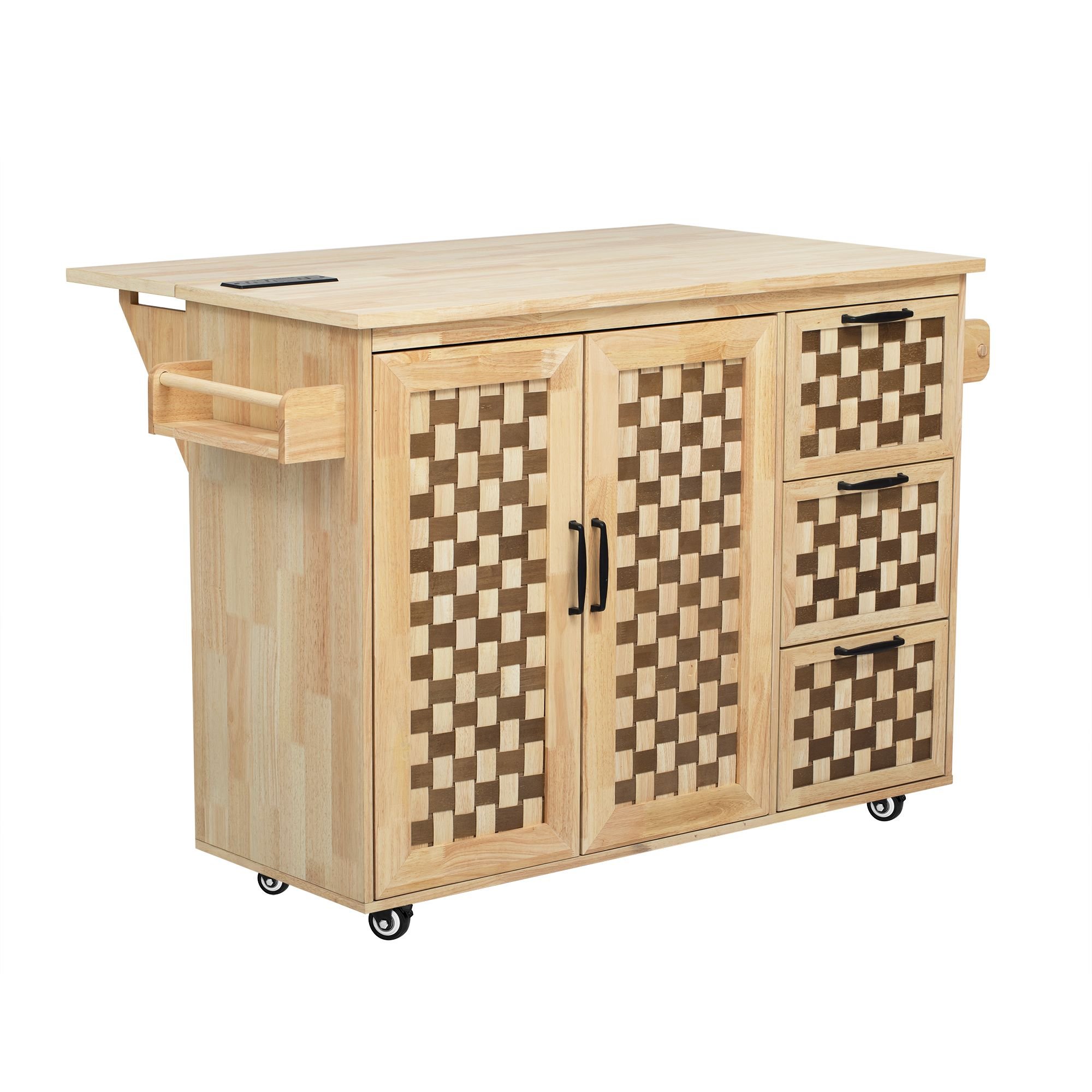 Our vintage style kitchen island boasts a beautiful woven checkerboard look design. The unique natural wood color look pairs well with the two-tone woven dimensional checkerboard grid surface. Every part of this kitchen cart is crafted with care.