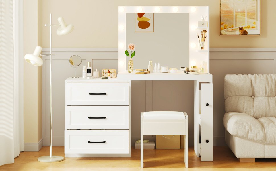 3.3 Lighting Color: Features a big mirror and 11 Hollywood bulbs, with 3 different color modes: warm yellow, natural light and cold white, can match your different makeup needs for working or dating. Nice make up vanity for bedroom, dressing room, salon or live broadcast.