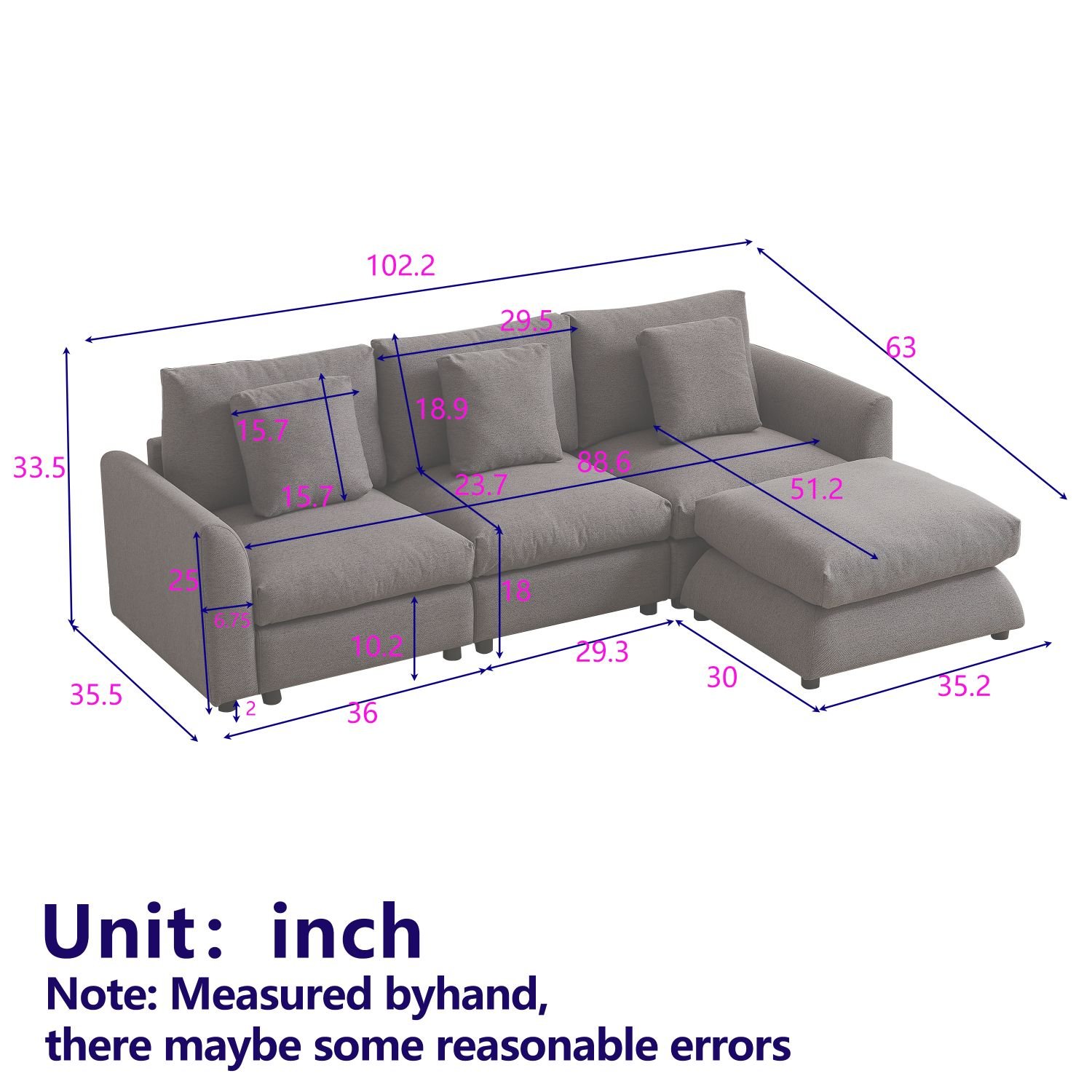 EASY TO ASSEMBLE: OVERALL DIMENSION: L 102.2 INCHES x W 63 INCHES x H 33.5 INCHES: The sofa comes with clear instructions and all necessary tools to help you assemble the sofa easily and quickly. Please feel free to contact us if you encounter any problems during use.