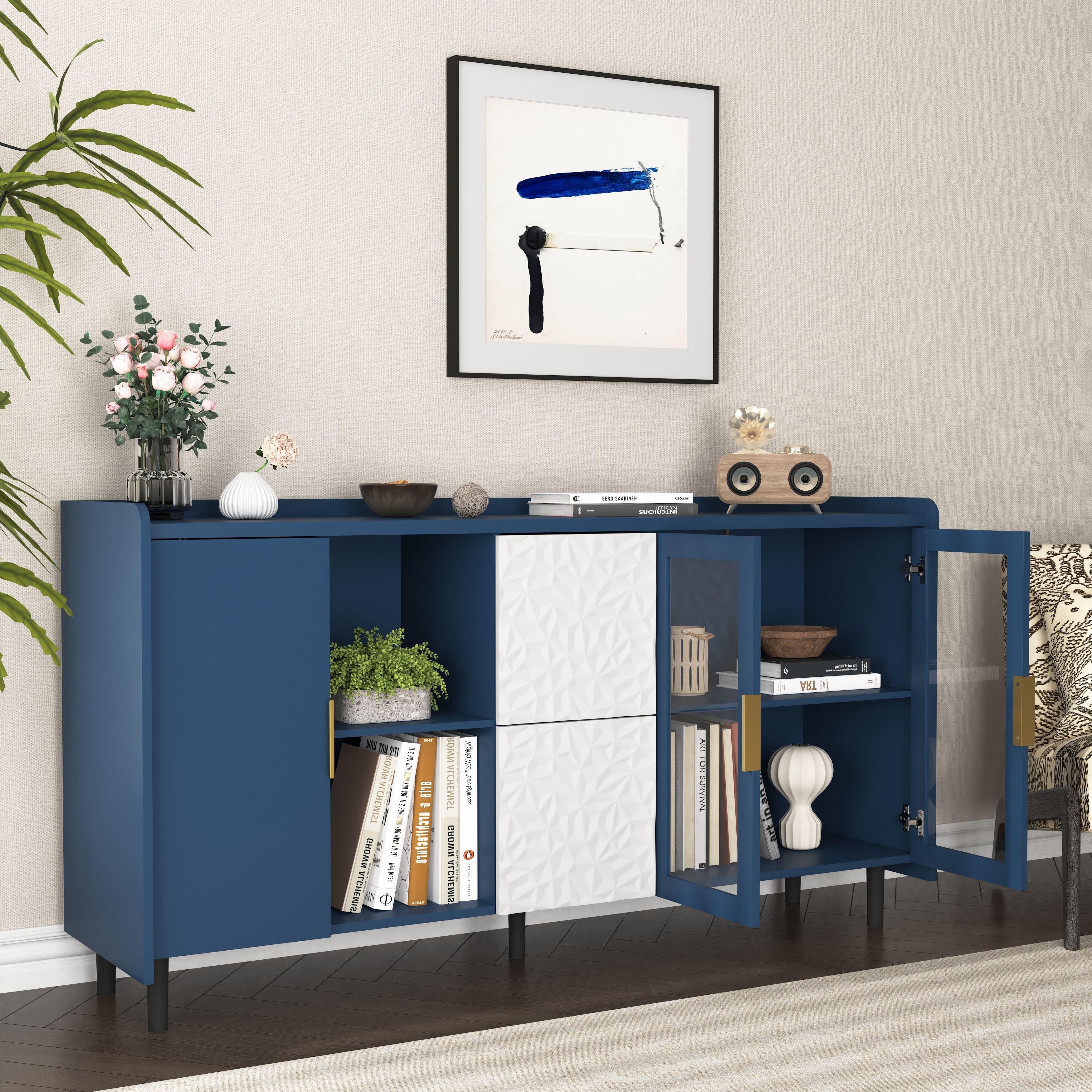 Modern Kitchen Pantry Storage Cabinet , 55" Coffee Bar Storage Cabinet with 2 Drawers, 2 Open Storage Compartment & 2 Glass Doors, Wood Buffet Table for Kitchen, Living Room, Blue