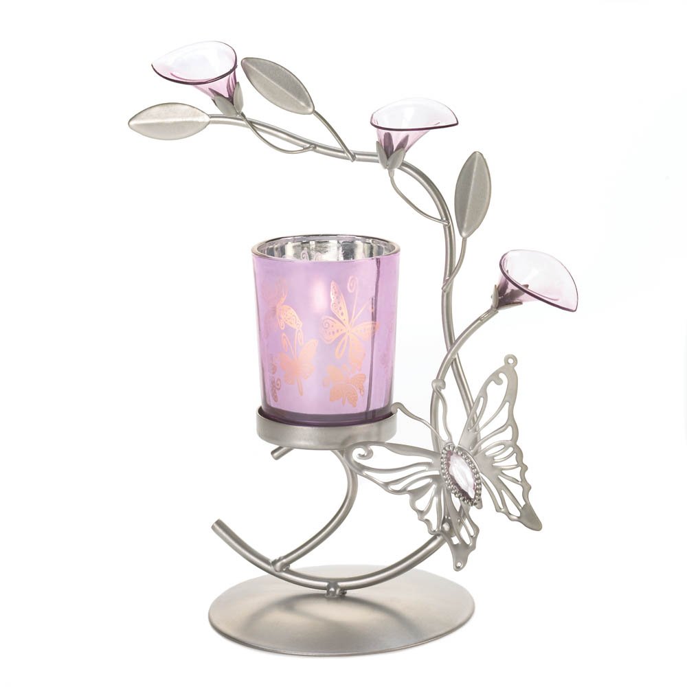 • Candlelight never looked so dreamy! This beautiful silver candle stand features a cutout butterfly fluttering past delicate lily flowers, while the glass candle cup shimmers with metallic finish and butterfly motif. Adds a warm, flickering glow to any room and makes an amazing housewarming gift.
