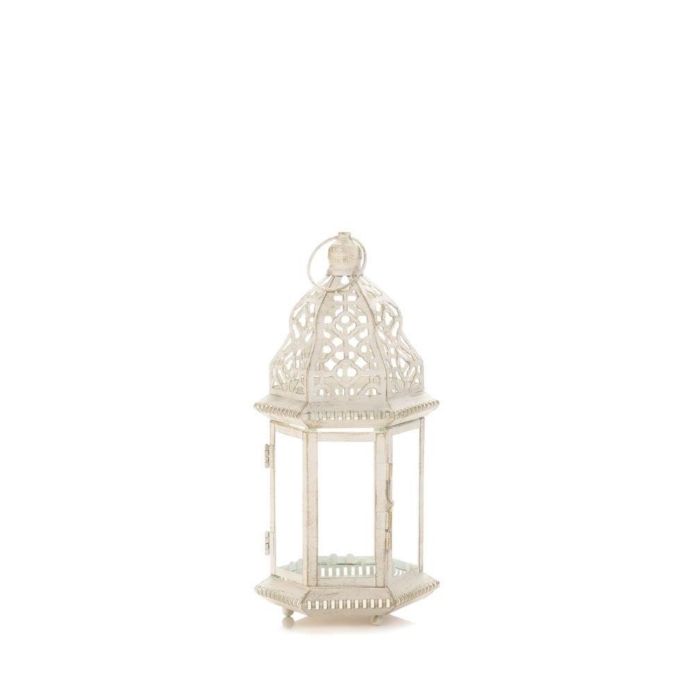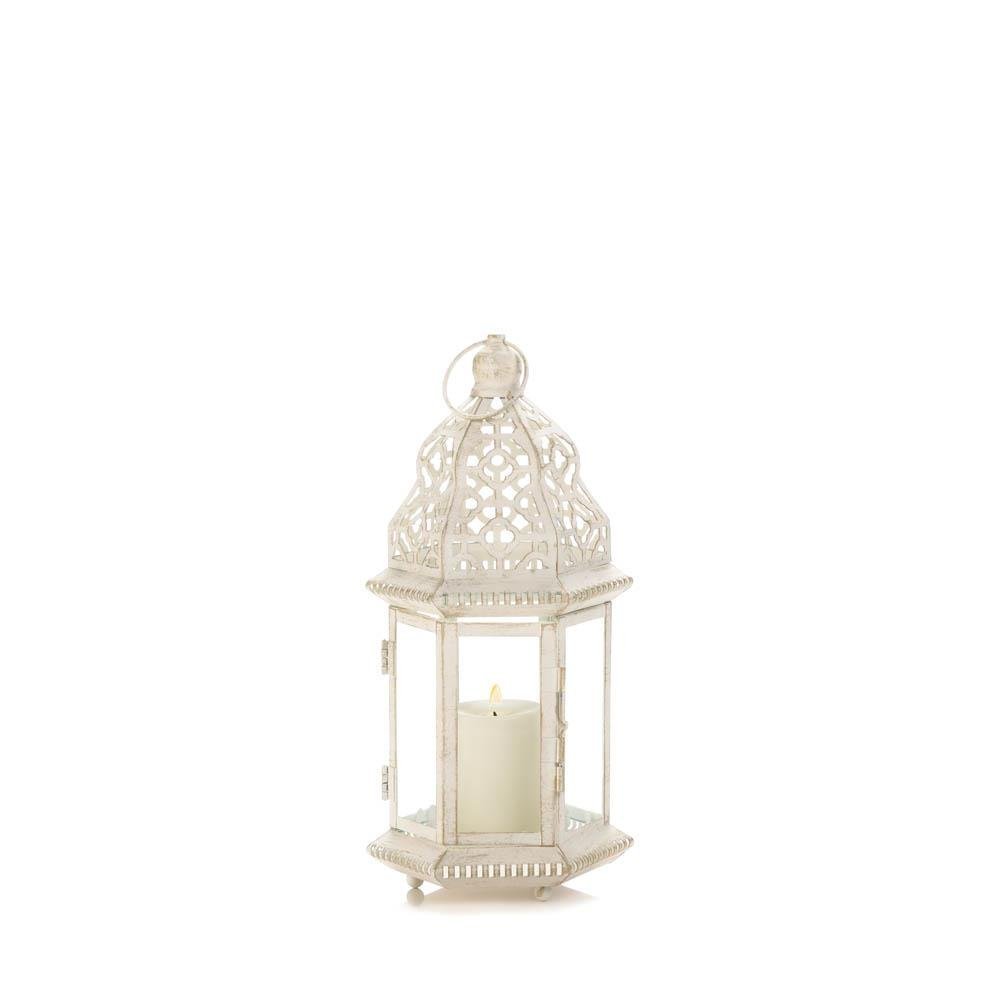 • A little bit of candlelight will go a long way when you light your favorite candle inside this beauty. The iron frame has a vintage white finish that perfectly showcases the intricate cutout details and flourishes.
