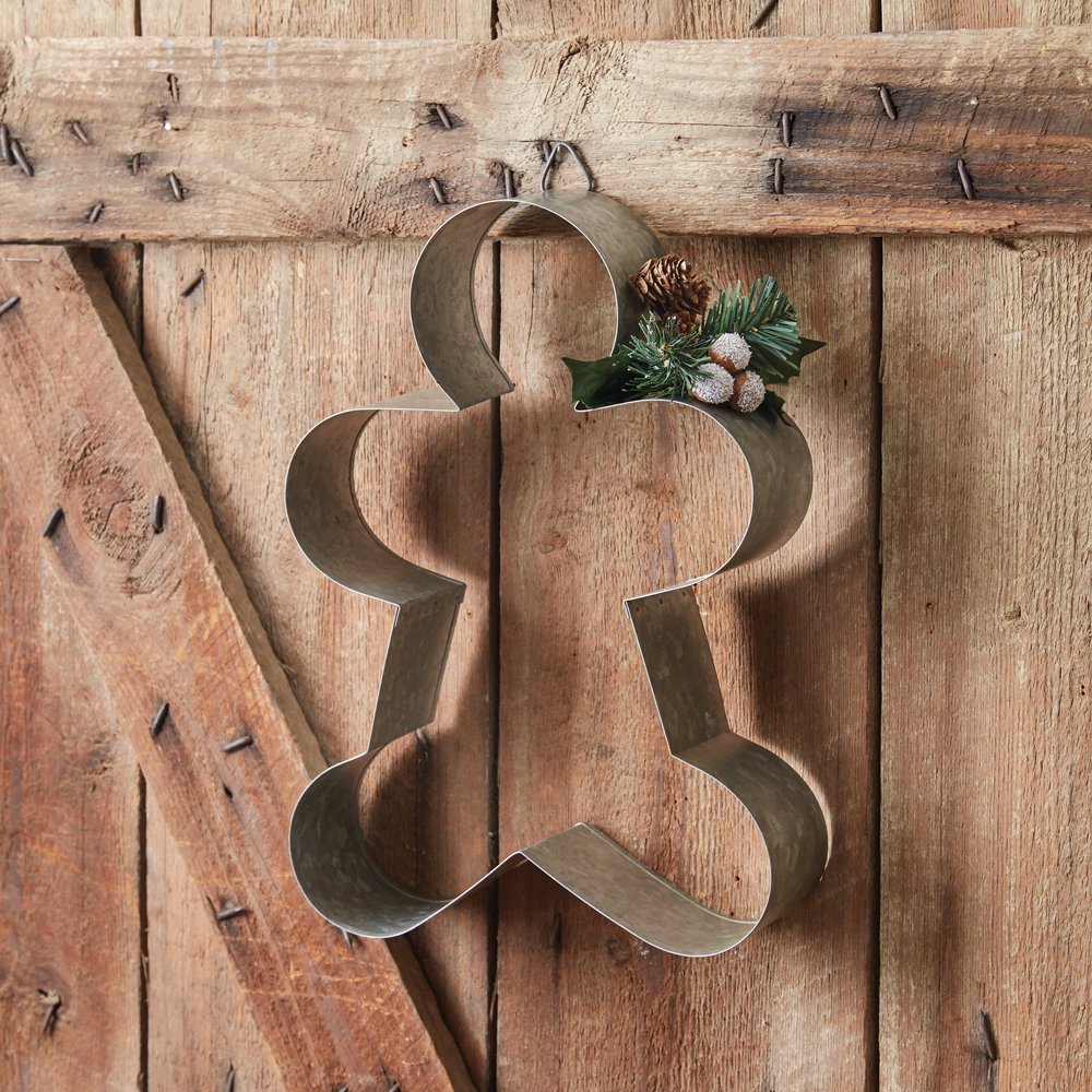 Baking cookies are a staple of Christmas-time activities! Incorporate this large gingerbread cookie cutter into your fun this year by hanging it on your kitchen wall. This cookie cutter is made of galvanized metal. To hang, use its triangle hanger.