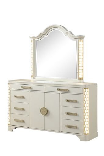 The 8-Drawer Dresser in this collection epitomizes a romantic, traditional charm, drawing inspiration from old-world European styling. Its captivating design is accentuated by unique lights positioned at each corner, creating an extraordinary statement of elegance. Further enhancing its luxurious appeal are the gold accent drawer pulls, adding a touch of opulence to its appearance. Beyond its aesthetic allure, this dresser boasts spacious drawers, offering functional storage solutions for your belongings.