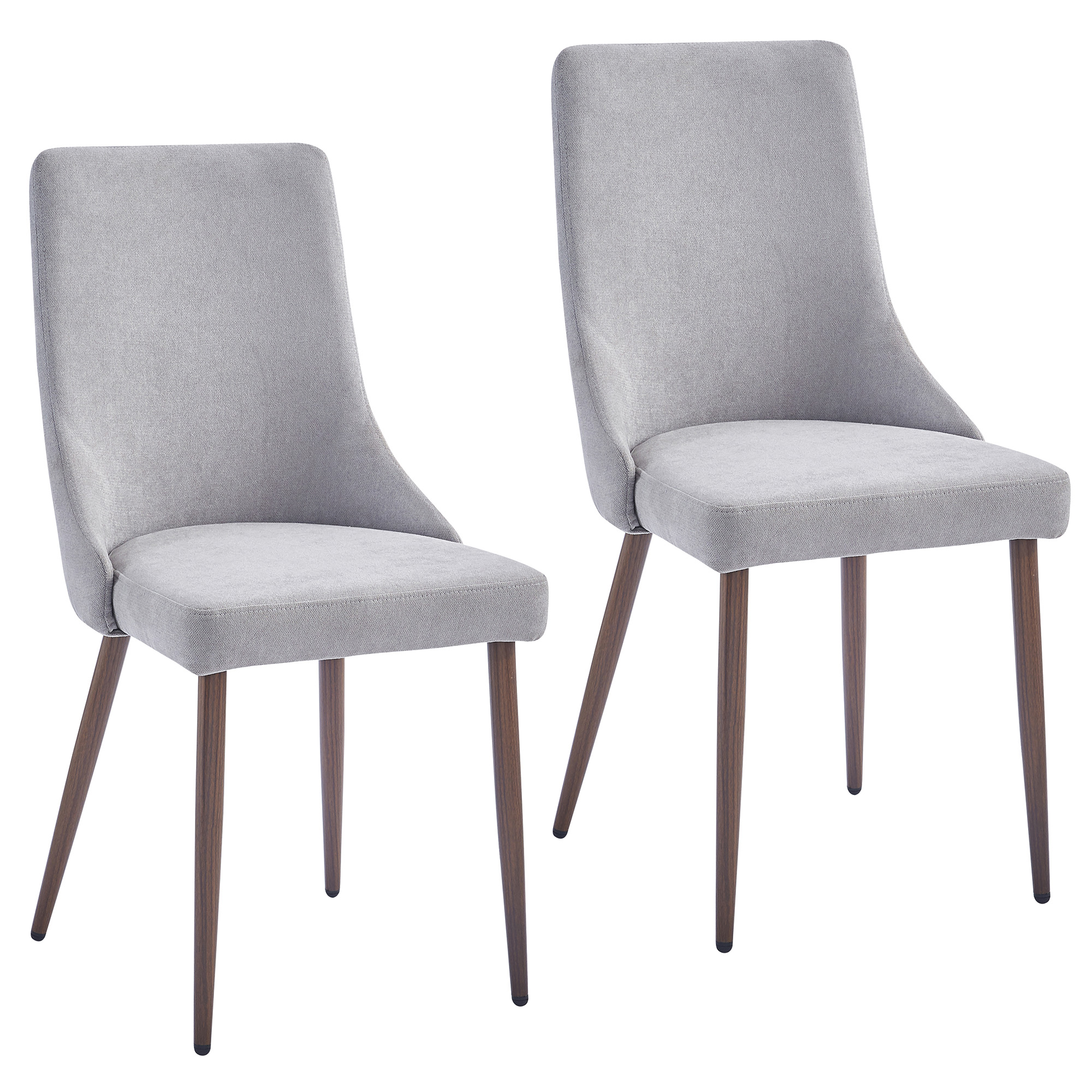 Composed of wood, fabric, and metal, this side chair is a show stopper all its own. With its curved wood seat frame, seat cushion covered in fabric upholstery, and metal legs emblazoned with a walnut finish through the process of heat transferring, this chair unifies a multitude of elements all into one perfectly composed design. The comfortable seat allows for hours of conversation around the dinner table, while the slim, tapered look of the metal legs adds a splash of sex appeal. The versatility of this unique piece allows it to be styled with a variety of furnishings.