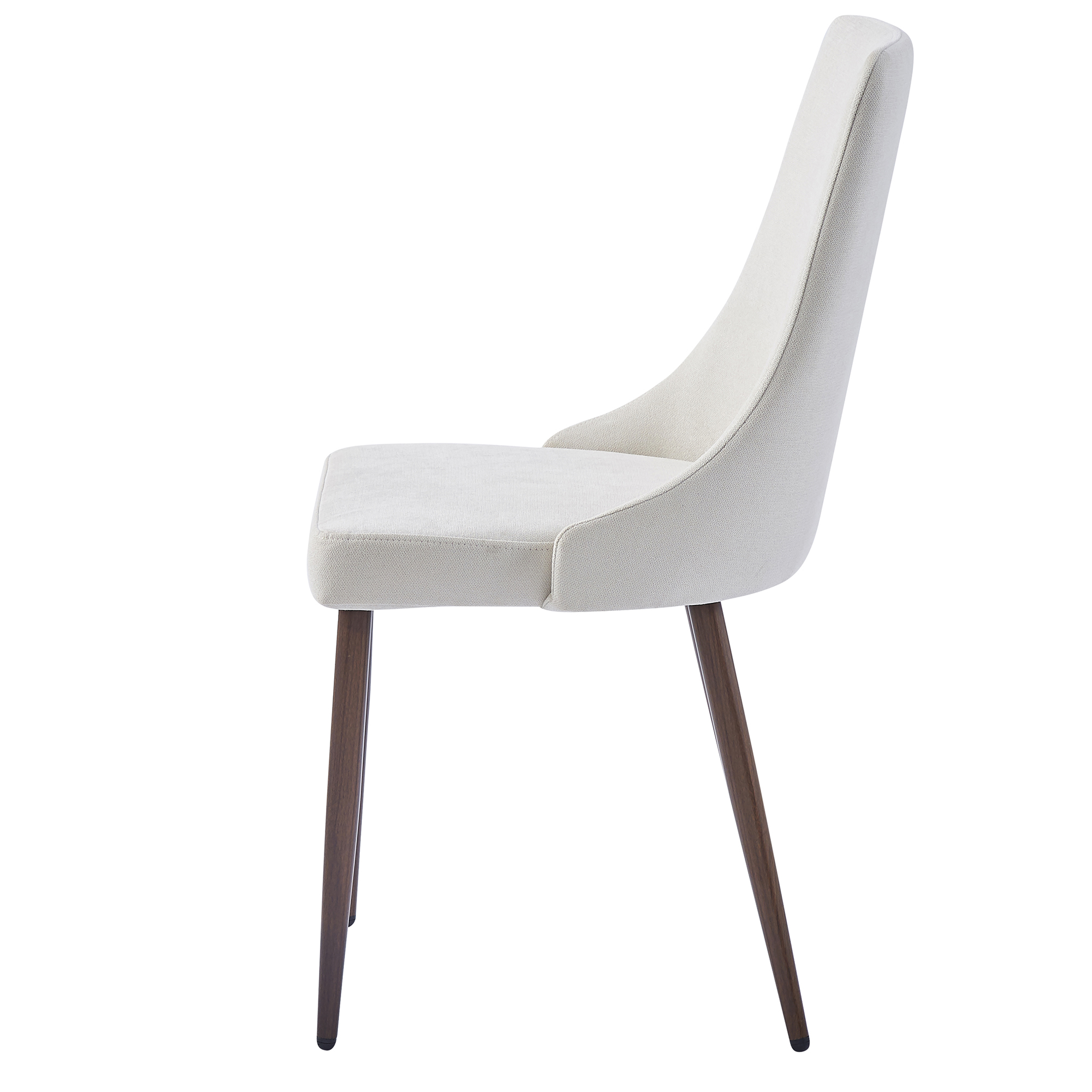 Incorporating a 10mm tempered clear glass tabletop on top of metal legs that have a walnut finish through the process of heat transferring, the illusion of crisscrossing geometric shapes makes this piece a conversation starter. Detailed with chrome-finished glass holders and table feet, this dining table seamlessly blends a fun and visually interesting appearance with a captivating style. Composed of wood, fabric, and metal, this chair is a show stopper all its own. With its curved wood seat frame, seat cushion covered in fabric upholstery, and metal legs emblazoned with a walnut finish through the process of heat transferring, this chair unifies a multitude of elements all into one perfectly composed design. The comfortable seat allows for hours of conversation around the dinner table, while the slim, tapered look of the metal legs have added appeal.