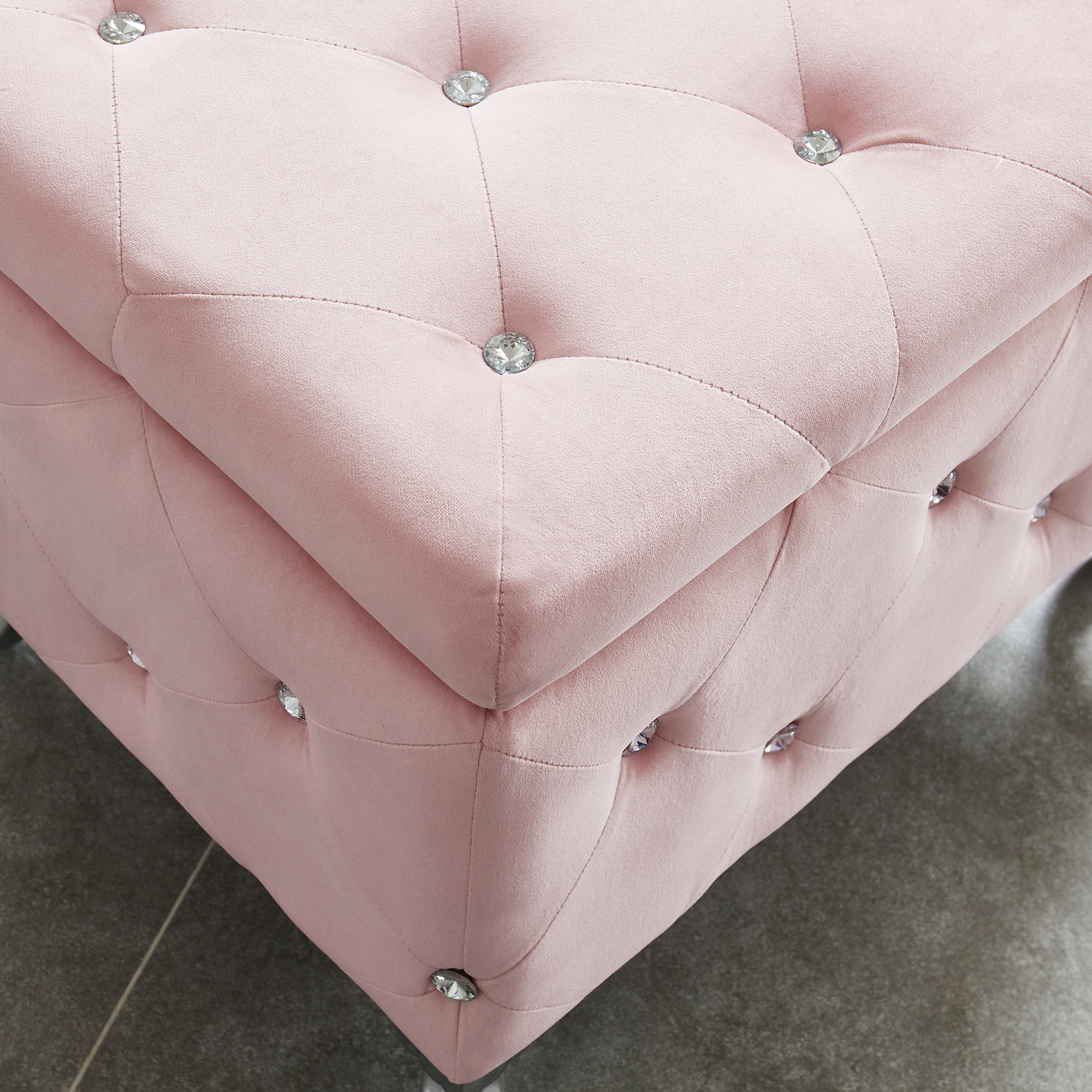 A storage ottoman can be a lavish touch to any home décor ensemble, but this ottoman is truly a one of a kind statement piece. With magnificent blush velvet upholstery, a beautiful, diamond-patterned stitching detail, and sparkling crystal button tufting, you'll think this piece came straight off of a fashion runway. Add to it the cabriole style legs with a chrome finish and this ottoman is sure to dazzle from any angle. Attention to detail is in all of the finishes as it includes a deep multi-purpose storage compartment and safety stop hinges to ensure that closing this ottoman will feel as soft and luxurious as it looks. Whether using it for storage or plush seating, this ottoman is sure to turn any ordinary room into something palatial. Perfect for near the door to add some bling to your entryway. Or place a clear tray on top and use as an elegant accent table.