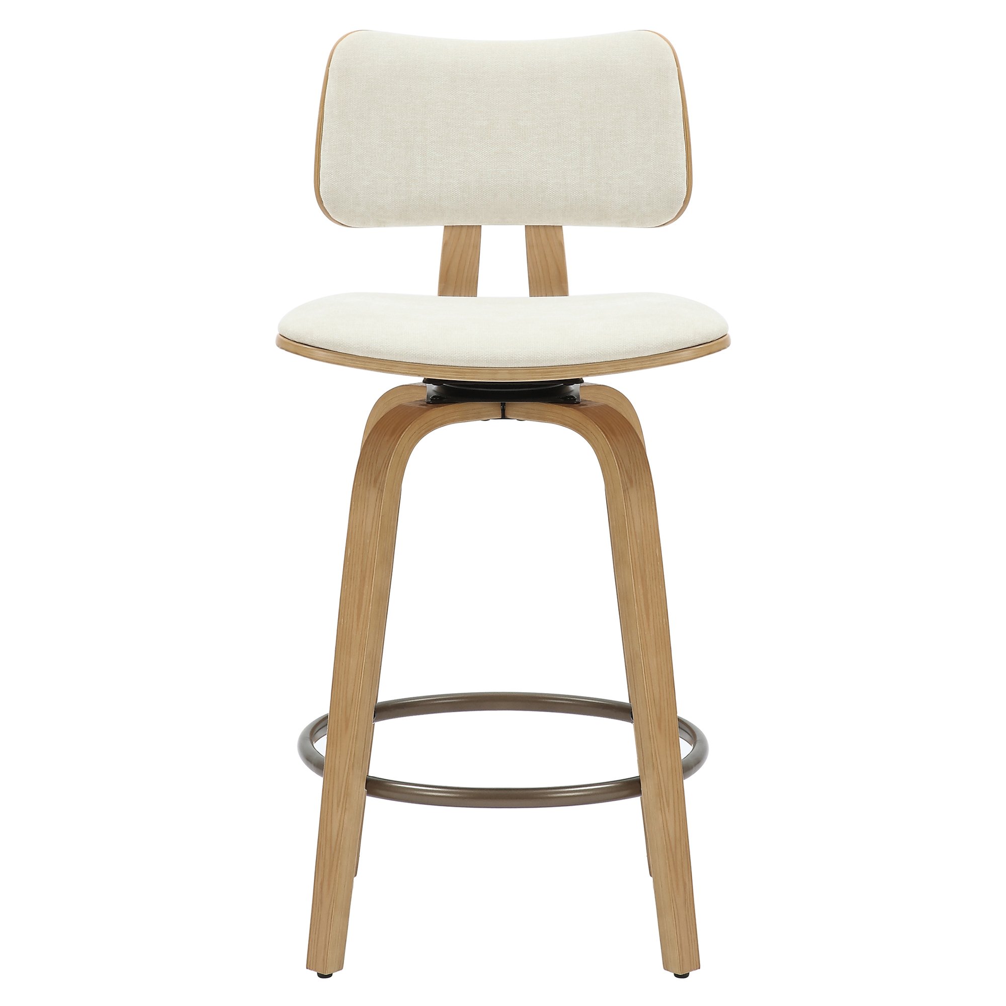 When the best of mid-century modern design is integrated perfectly into the current design world, you get gorgeous pieces like this stool. The bentwood frame and legs are beautifully finished in a natural wood finish, and the cushioning is all upholstered in a soft textured fabric - creating the perfect modern mid-century piece. The footrest is finished in dull aged gold and provides additional comfort. Full swivel allows for ease of use at any counter space.