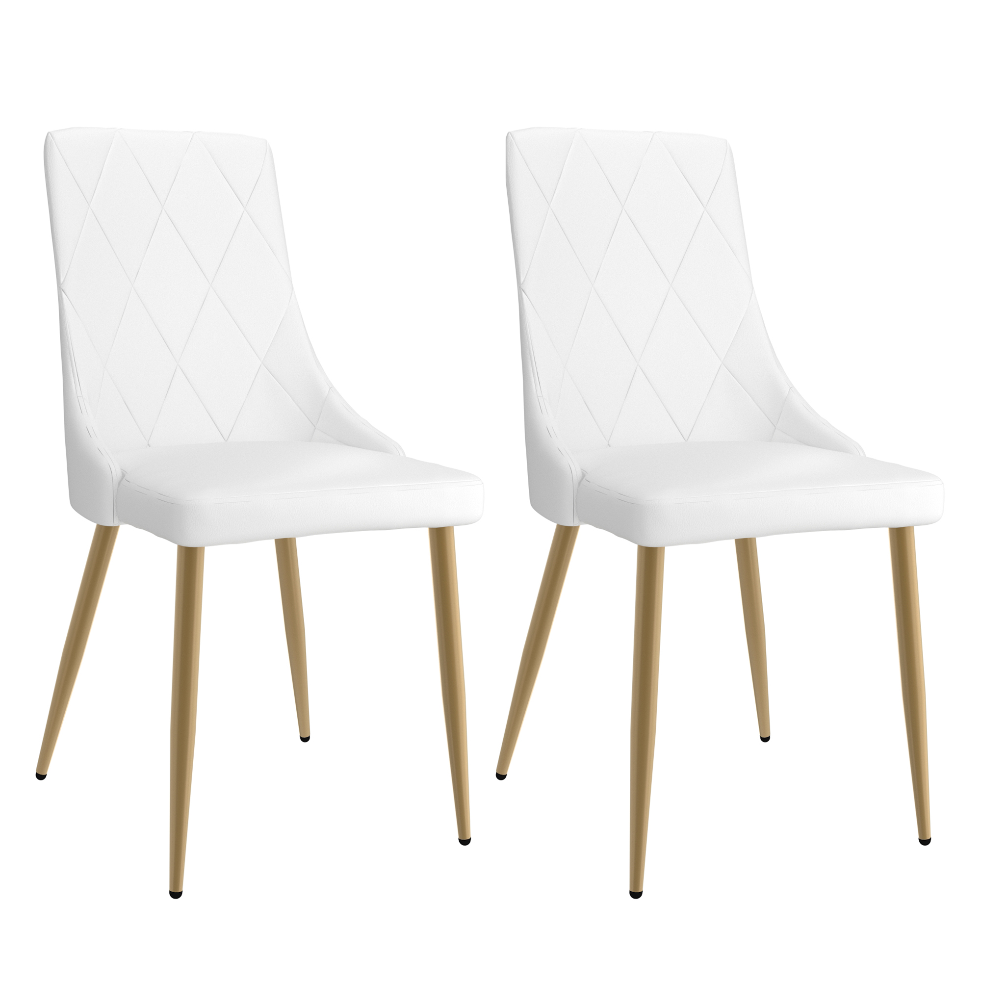 This gorgeous pedestal table brings the joy of formal dining back into everyday living. The winning factor is the multi-toned faux stone finish on the laminated veneer. The polyurethane protective coating provides a solid barrier against spills, scratches and LED light. The 48" diameter will comfortably seat up 6. Composed of wood, faux leather, and metal, this side chair is a show stopper all its own. With its curved wood seat frame, seat cushion covered in faux leather upholstery with stitching details on the back, and chrome-finished metal legs, this chair unifies a multitude of elements all into one perfectly composed design. The comfortable seat allows for hours of conversation around the dinner table, while the slim, tapered look of the metal legs adds a splash of sophisticated design.
