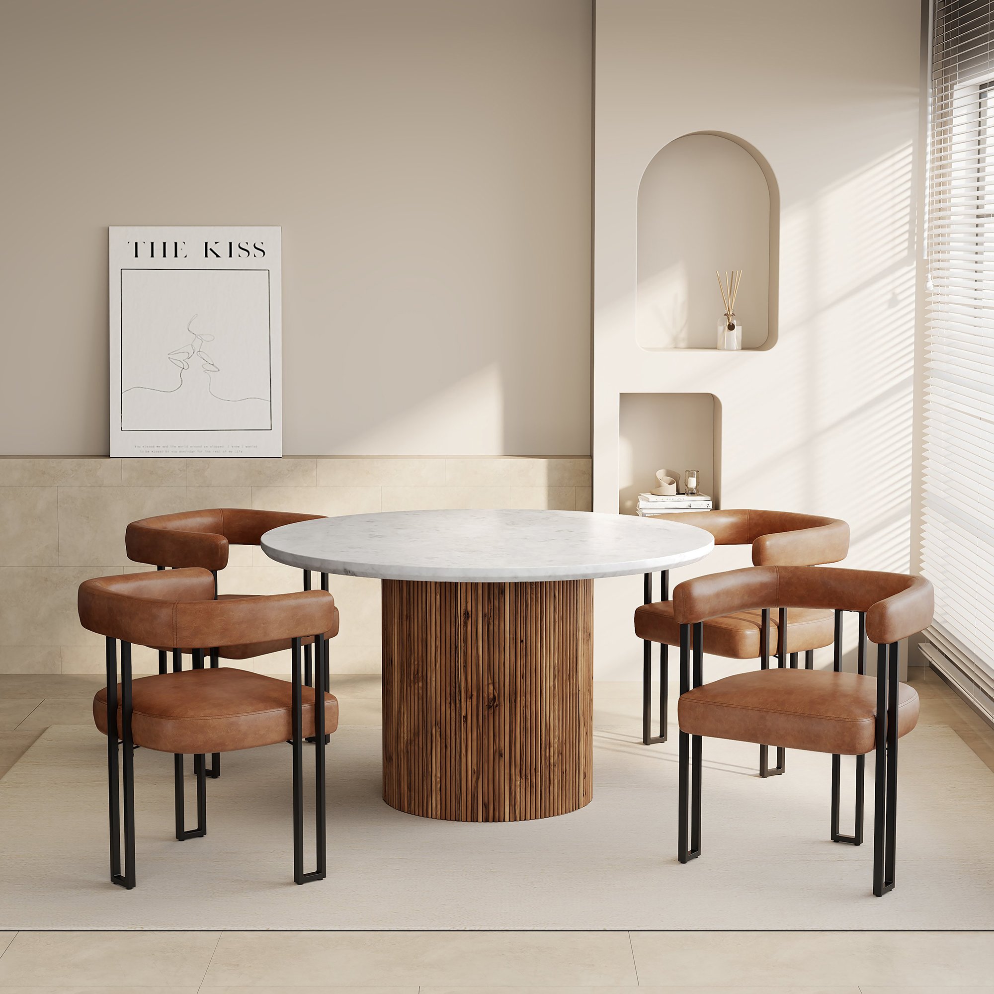 This gorgeous and sophisticated table is meticulously crafted from sustainably-sourced, solid mango wood, providing a rich and sturdy foundation. The reeded finish on the pedestal is perfectly topped with a thick, bevelled marble top creating a refined piece that will elevate your carefully designed space. Large enough to comfortably fit up to 6 chairs. Bring the magazine-worthy dining experience to life with these beautiful, faux leather-upholstered dining chairs. The vintage saddle faux leather is a sophisticated look that will easily create a high-end feel in your space. The square-line black metal frames and supports the chair perfectly, providing hours of seated comfort.