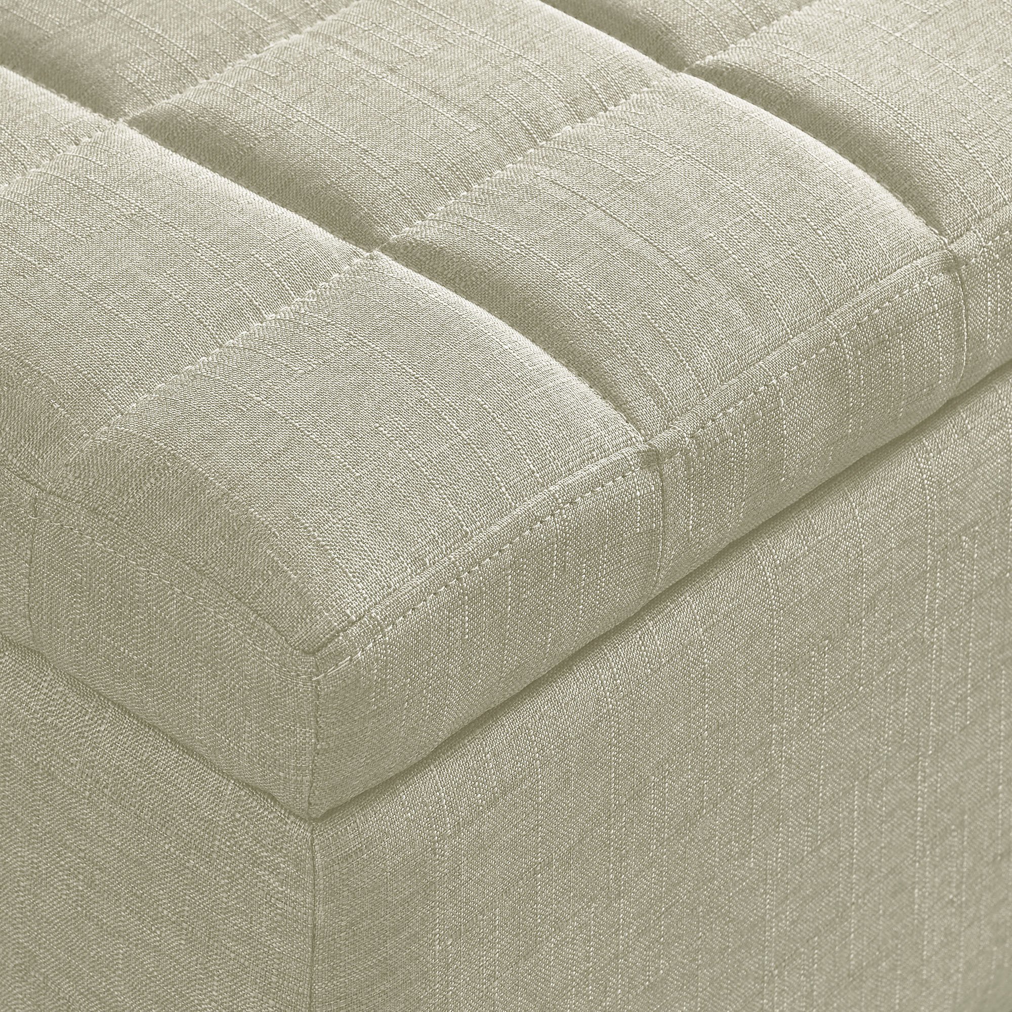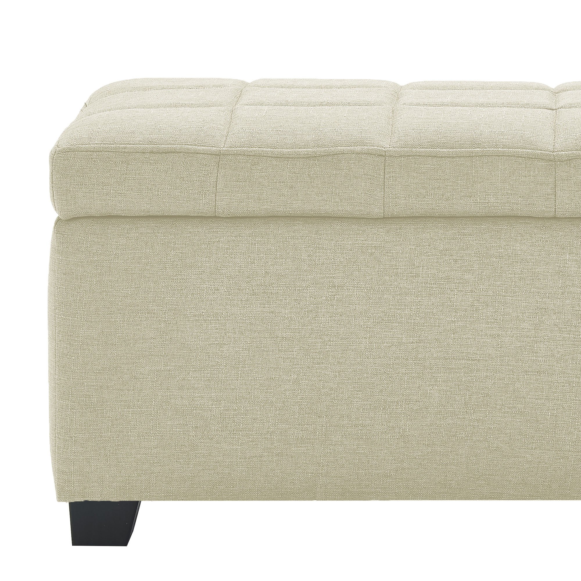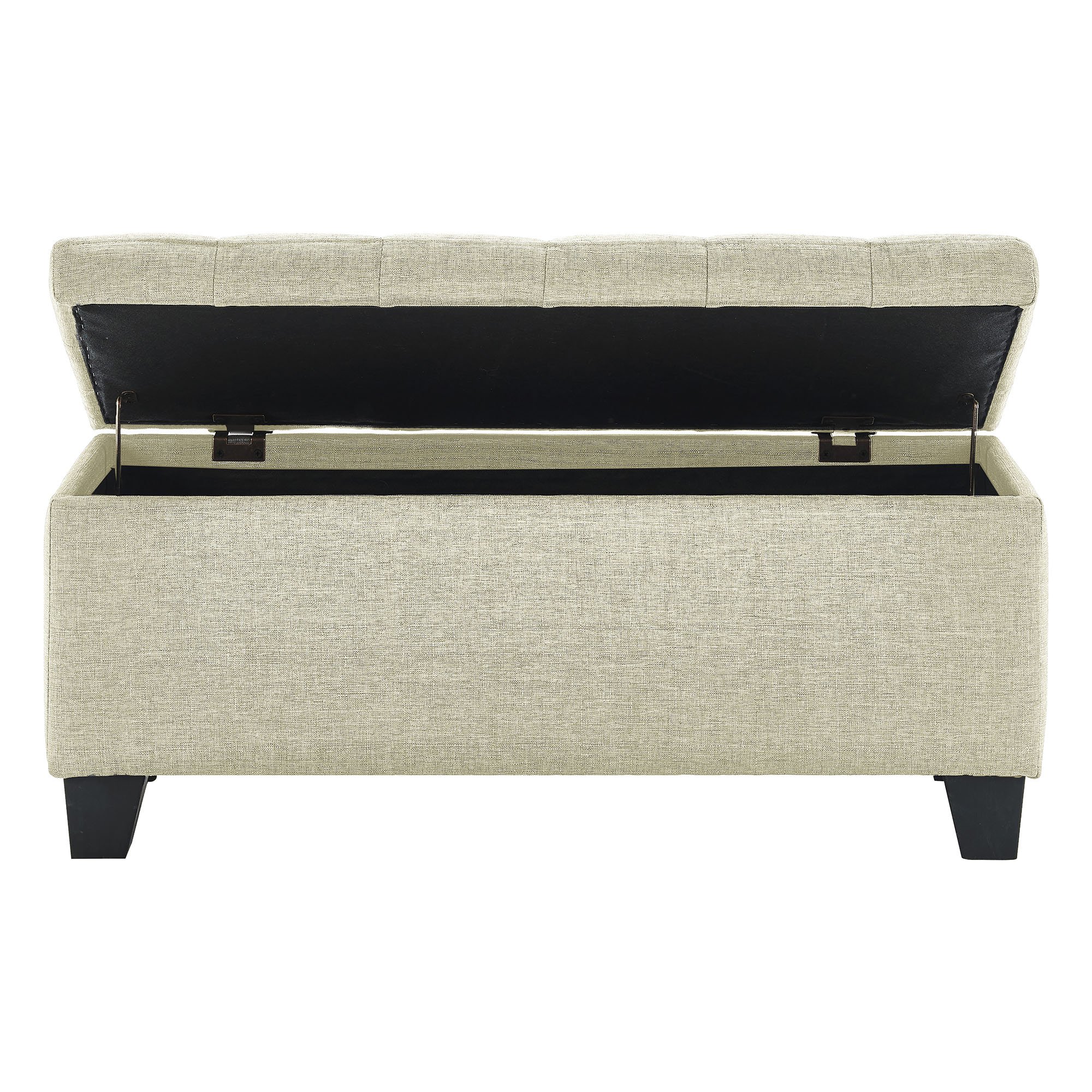 Items you keep in this ultra-deep storage ottoman may be out of sight and out of mind, but this piece can stay front and centre! A perfect add-in to any space for extra seating when needed and extra storage always available. The tufted, upholstered design will work well in any space. Safety-stop hinges keep fingers safe by preventing any accidental slamming of the seat. Sturdy black legs provide stability and support in this versatile piece.