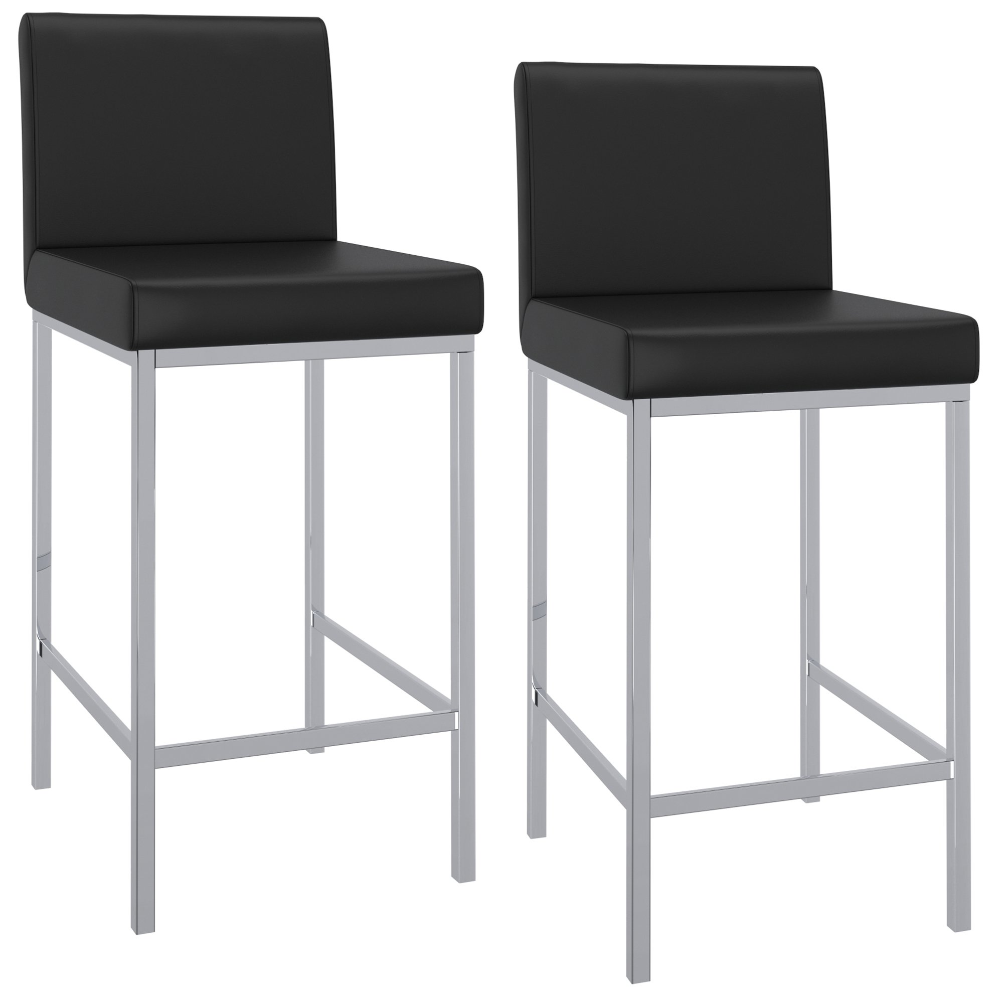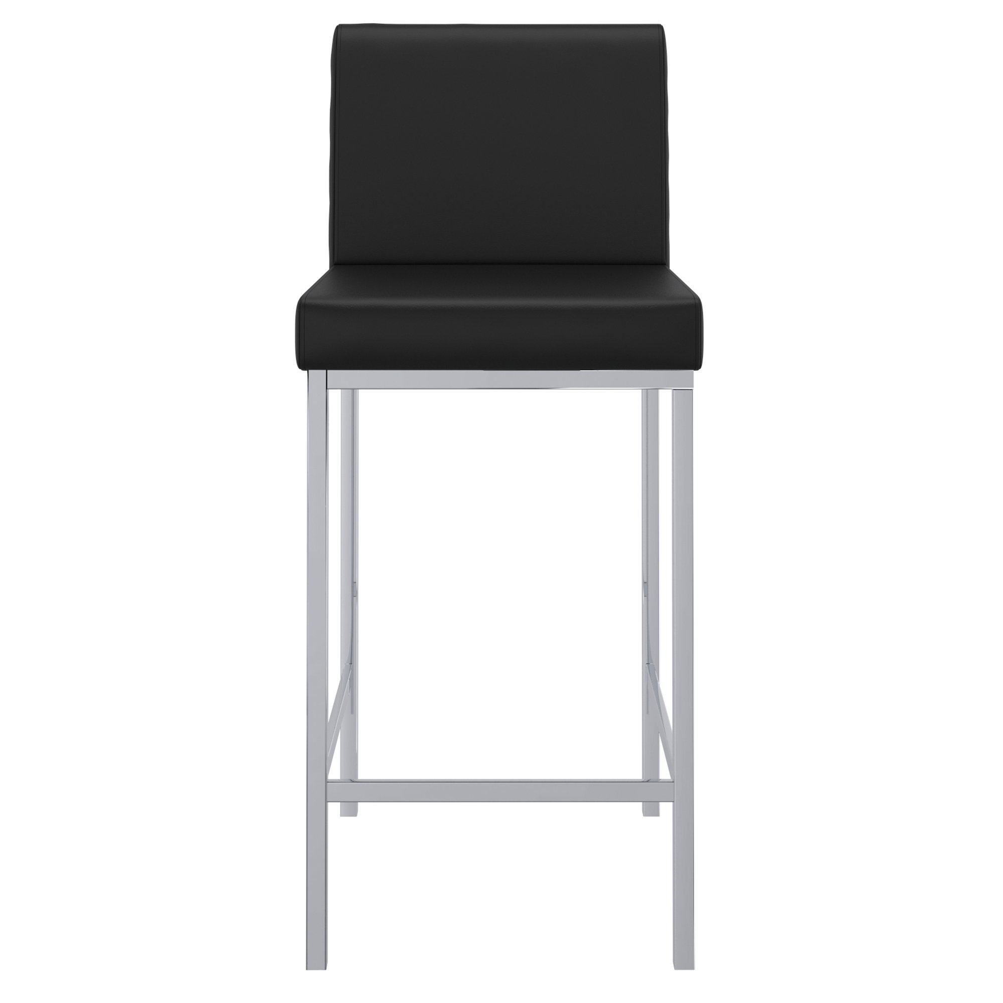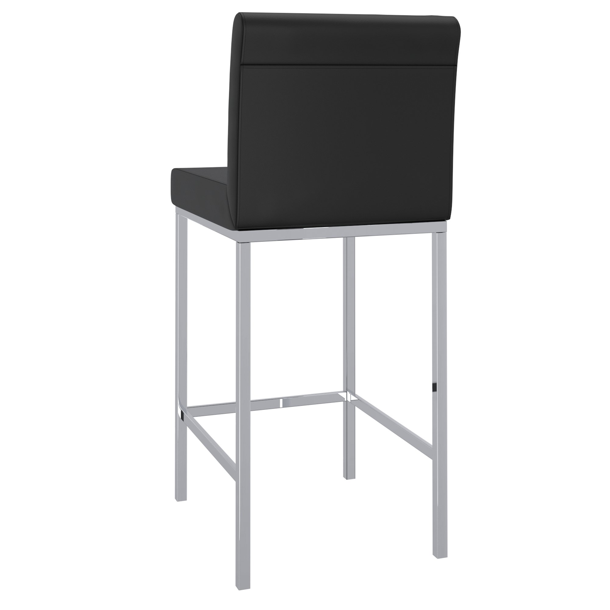 Contemporary counter height stool with faux leather and shiny chrome finishing. Combined, these two materials create a modern piece that will work will with any decor. The low back provides ample back support while adding to the minimalist appeal. Great for a casual breakfast bar or for the fancy basement bar where you can spend hours conversing with guests.