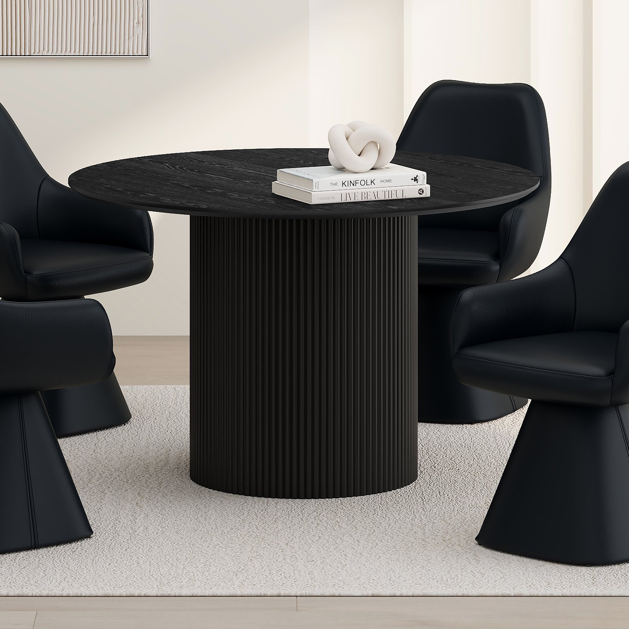 Elevate your dining experience with this round pedestal base dining table, a hallmark of high-end designer inspiration. Featuring a beautifully reeded wood base, this table exudes timeless charm, offering a refined focal point for any dining space. The bevelled table top and the visible wood grain throughout add natural beauty and organic texture.